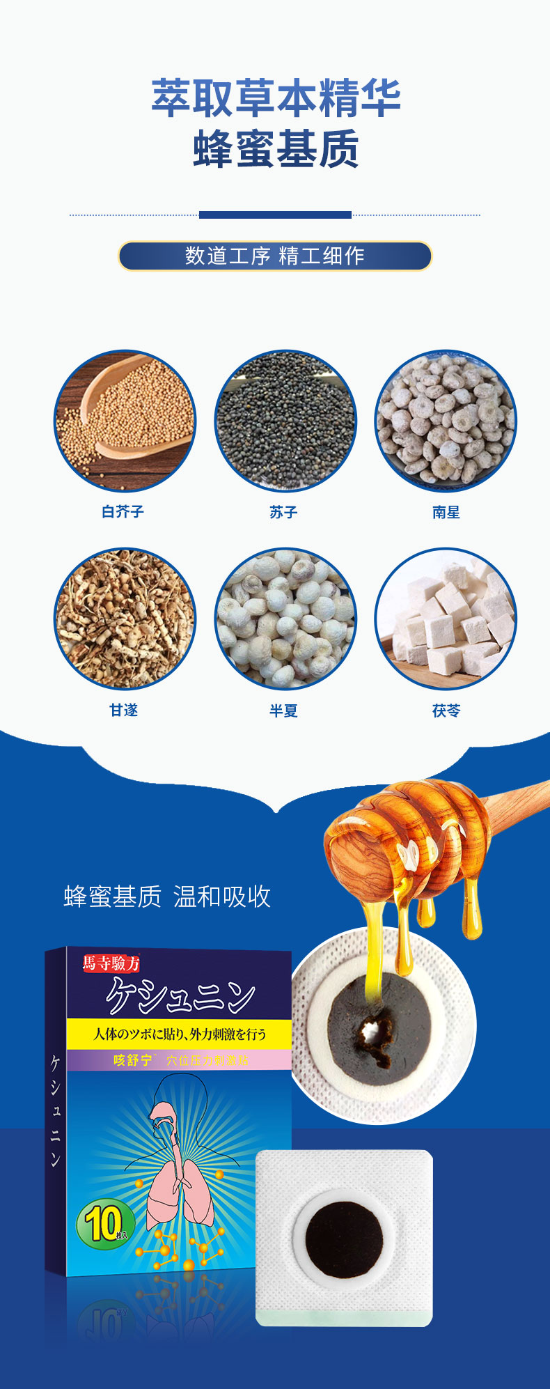 馬寺驗(yàn)方咳舒寧穴位貼,萃取草本,蜂蜜基質(zhì)溫和吸收,數(shù)道穴位貼加工工序,無(wú)紡布背襯穴位敷貼透氣親膚,貼敷方便,小巧便攜,持續(xù)溫護(hù)24小時(shí),正規(guī)工廠,標(biāo)準(zhǔn)化生產(chǎn)車(chē)間,多樣化定制,出貨快,承接貼牌代加工,支持批發(fā)代理,量大從優(yōu)。